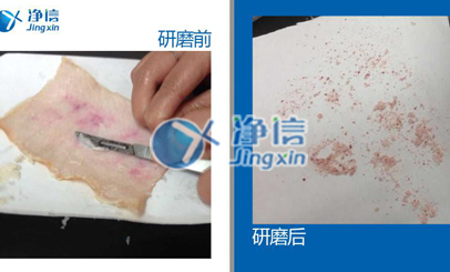 通過(guò)研磨脫脂豬皮樣品,對(duì)樣品細(xì)胞進(jìn)行提純,研究其藥物作用。破碎過(guò)程中脫脂豬皮組織需要在低溫中進(jìn)行,樣品本身較為堅(jiān)韌,處理過(guò)程比較繁瑣,所以客戶選擇使用上海凈信研磨儀進(jìn)行前處理破碎。