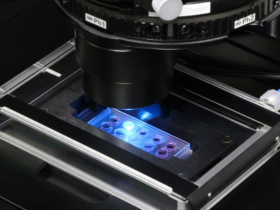 The μ-Slide 15 Well 3D can also be used as a low-volume microscopy chamber without any gel, which is useful for experiments where several wells with a low volume are required.