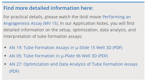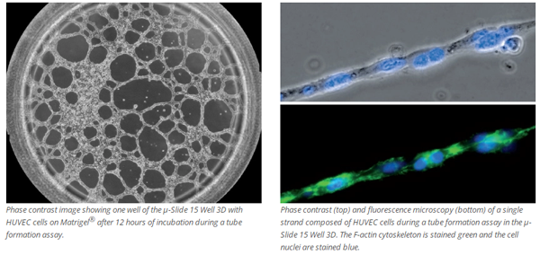 The μ-Slide 15 Well 3D has a specialized geometry for the easy, convenient, and reproducible conduction of tube formation assays. It is also ideal for sprouting assays, immunofluorescence staining, and general 3D cell culture.