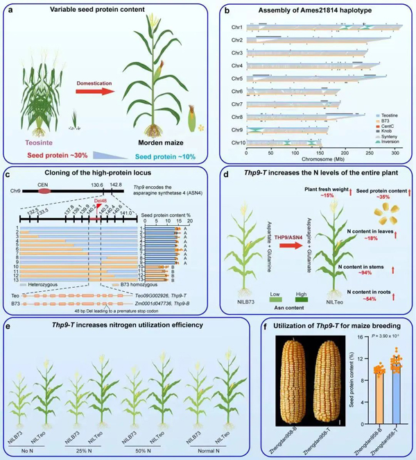 經過10年堅持不懈的努力,科研人員終于從野生玉米中克隆了控制玉米高蛋白品質形成和氮素高效利用的關鍵變異基因Teosinte High Protein 9 (THP9)。