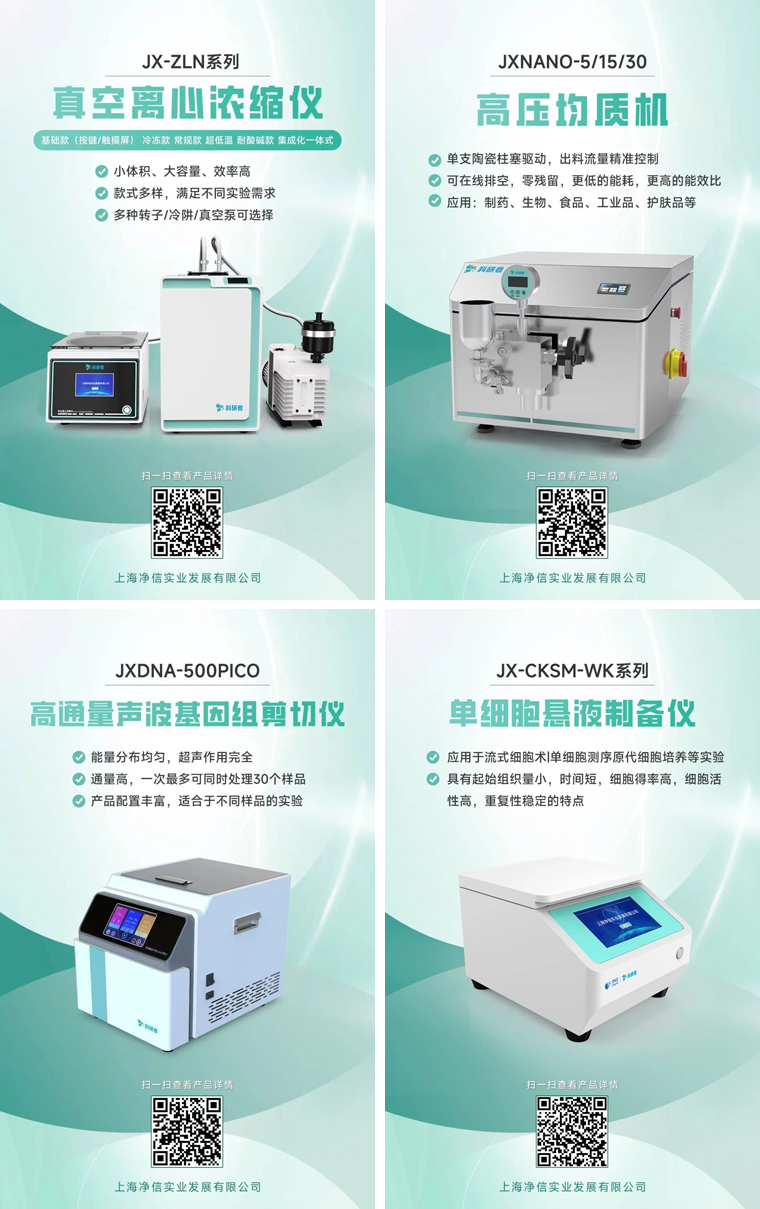 十幾年來凈信不斷進行自我創(chuàng)新與突破。通過持續(xù)優(yōu)化產(chǎn)品性能和提升服務質(zhì)量,我們實現(xiàn)了從單一產(chǎn)品到多元化發(fā)展的轉(zhuǎn)變,拓展了市場影響力。上海凈信科研者系列產(chǎn)品也在上市推廣中!真空離心濃縮儀、高壓均質(zhì)機、單細胞懸液儀、高通量聲波基因組剪切儀。