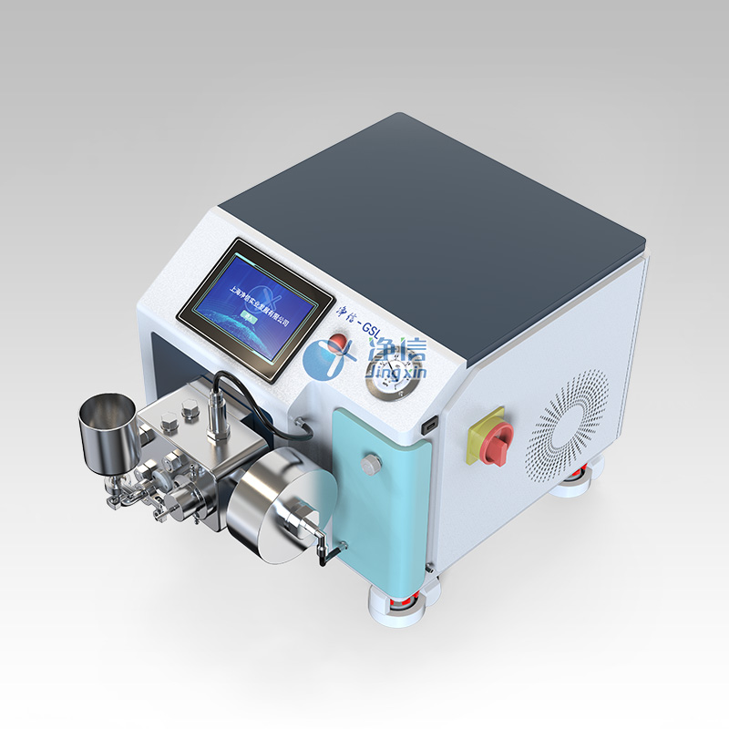 上海凈信高壓納米均質機GSL-15QD是一種超細粉碎,乳化設備。采用單作用往復柱塞泵加均質閥設計。以壓縮 空氣為動力源,通過氣缸將氣體壓力轉換為液壓能,使物料在高壓腔內被逐步壓縮;高壓狀態下的物料經均質閥的狹 窄縫隙時,流速劇增,產生強烈的碰撞、剪切、空穴效應,將其中的大顆粒、液滴等破碎成更小的微粒,實現均質、 乳化或分散效果;此外,還可通過調節進氣壓力精準控制輸出液壓,并支持物料循環處理,以達到理想的均質效果。